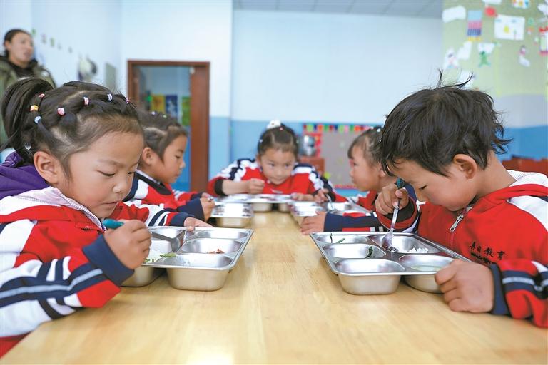 扎嘎新村的幼兒園里,孩子們正在吃營養餐。通訊員 侯勇 嘉措 攝