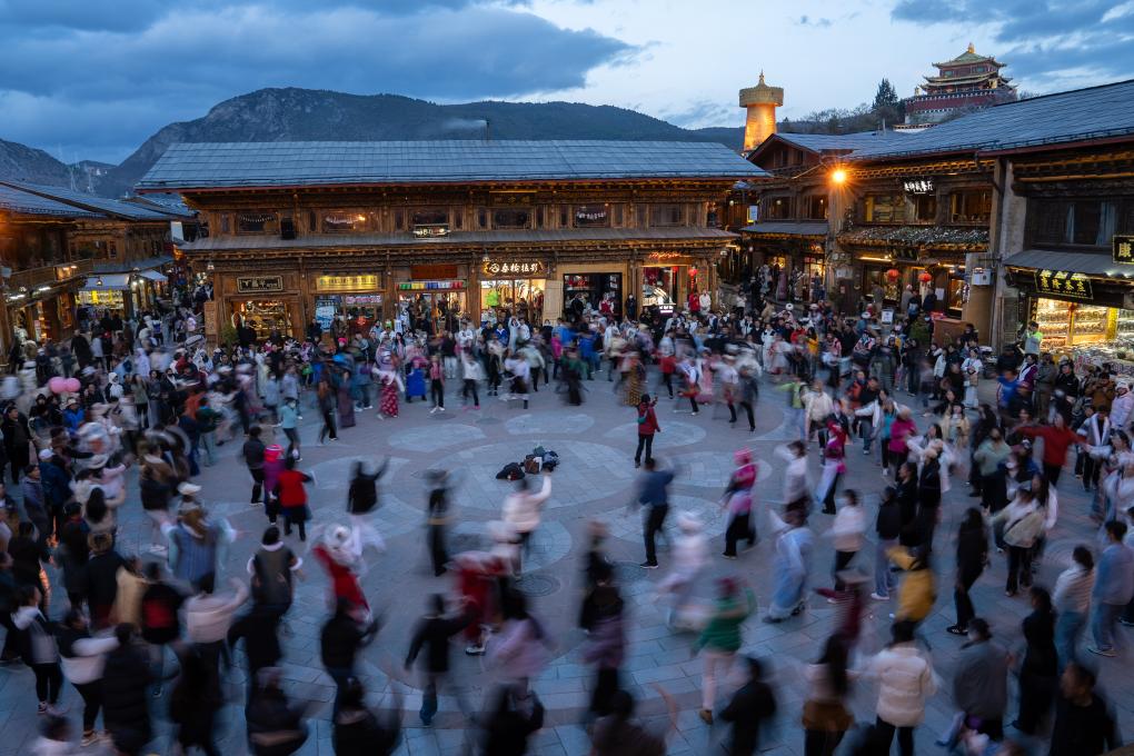 2024年5月3日,在云南迪慶藏族自治州香格里拉市,游客與當(dāng)?shù)厝罕娫讵?dú)克宗古城四方街廣場(chǎng)跳鍋莊。新華社 馬宏波 攝
